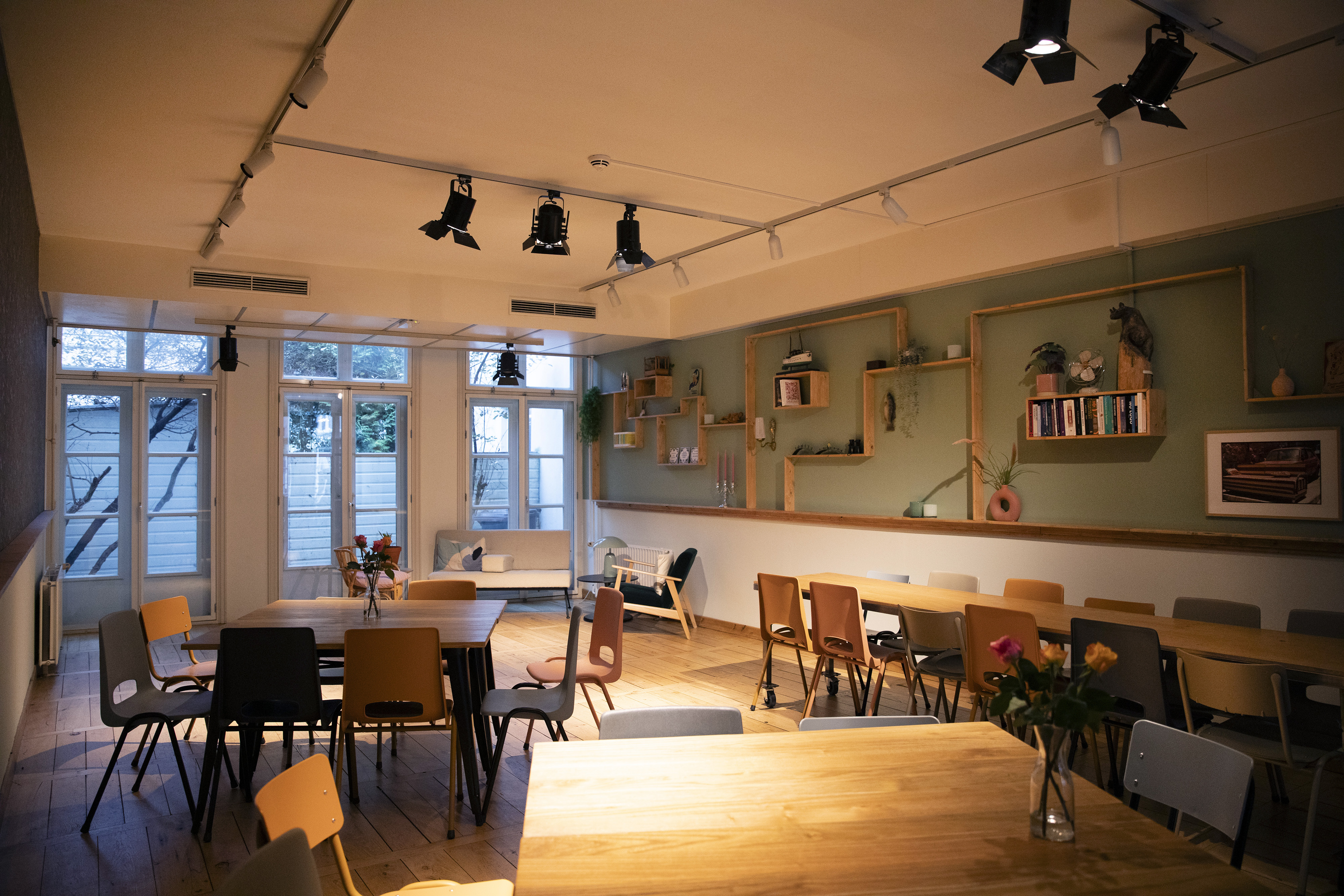 Onze foyer is gelegen op de begane grond van ons pand. De ruimte wordt in tweeën gescheiden door middel van een glazen pui met deuren voorzien van gordijnen. De ruimte aan de voorkant van ons pand grenst middels een bar aan de keuken. De foyer is geschikt voor maximaal 25 personen. Er staan diverse tafels en stoelen in de ruimte, maar deze is naar eigen inzicht in te delen. De foyer is geschikt voor bijvoorbeeld lezingen, workshops en vergaderingen.